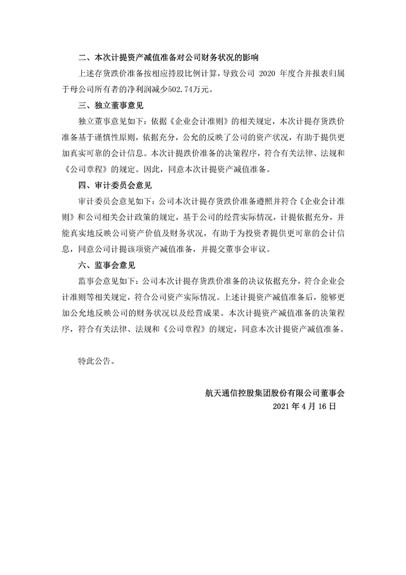 航天通信控股集團股份有限公司關于2020年度計提資產減值準備的公告
